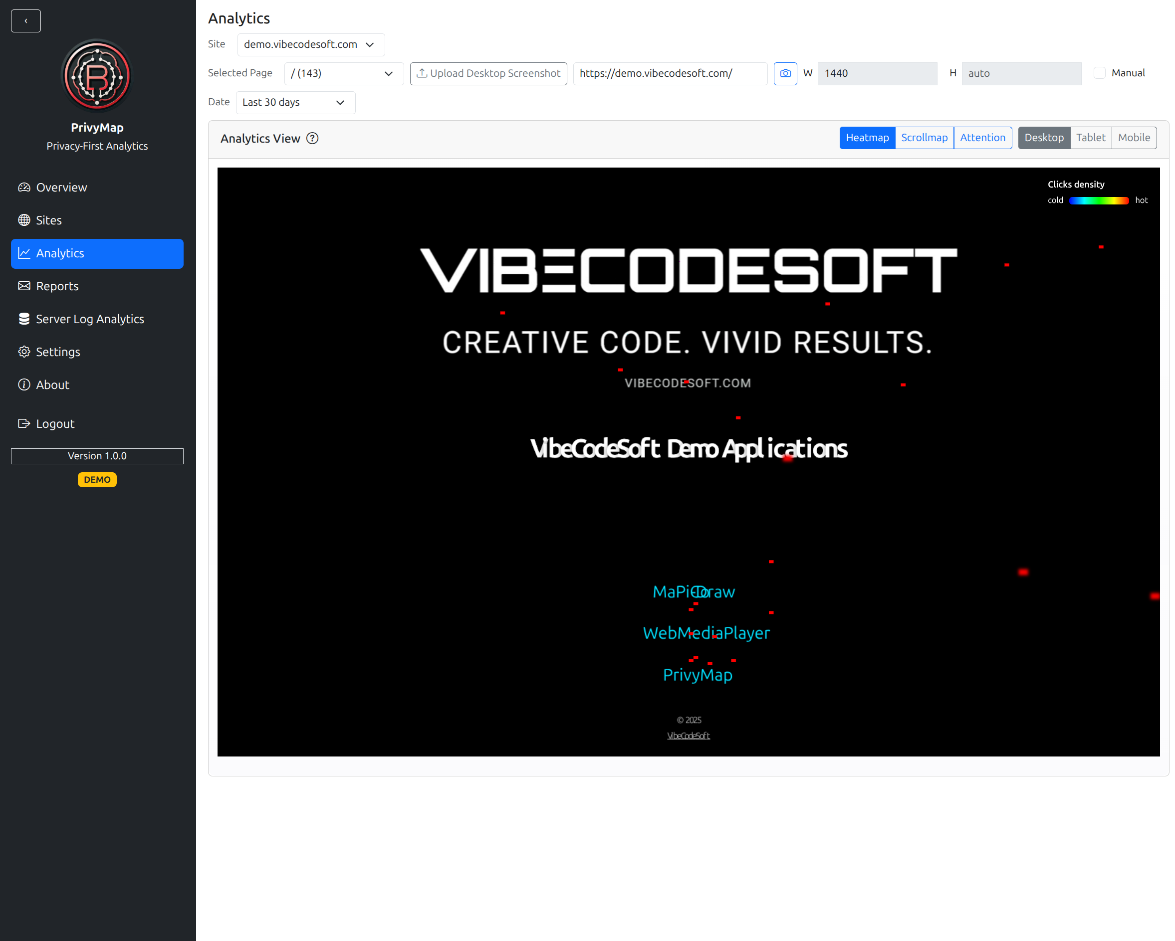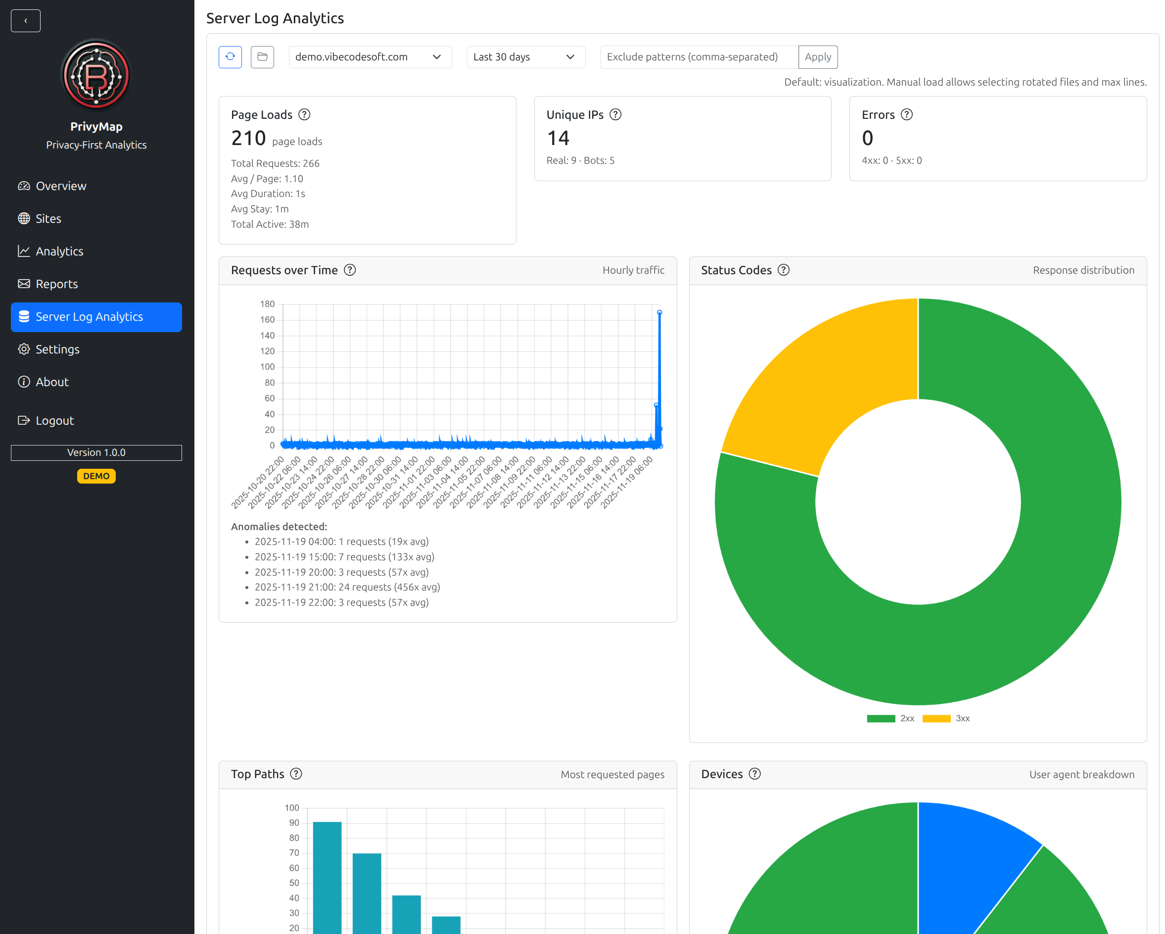 PrivyMap is a lightweight, fully self-hosted web analytics system without cookies and without personal data. Ideal for businesses, developers, and agencies that need precise usage analytics – without tracking bloat and without GDPR risks.