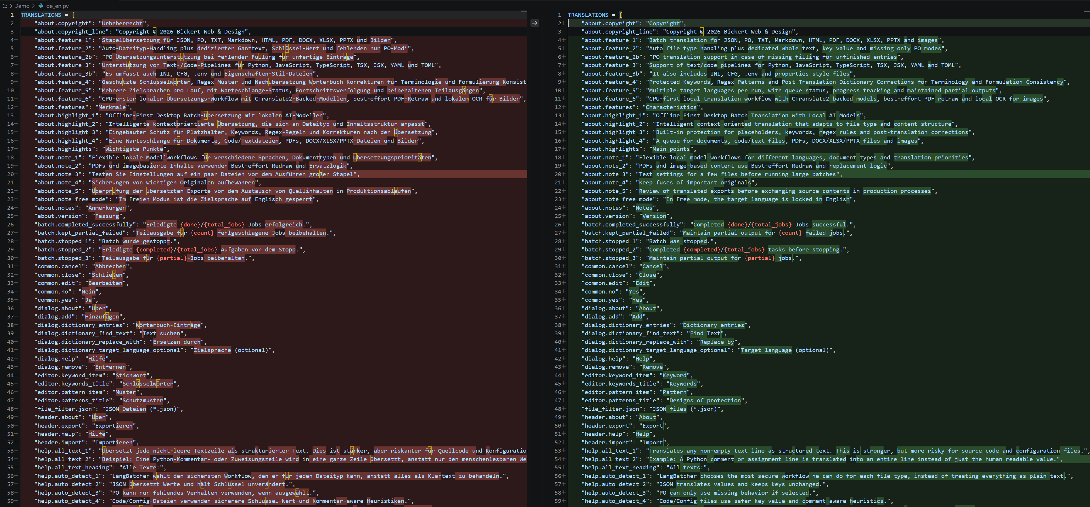 Übersetze nur menschlich lesbare Inhalte in Dateien wie Python, JavaScript, TypeScript, YAML, TOML, INI, CFG,.envoder Properties-Dateien. -