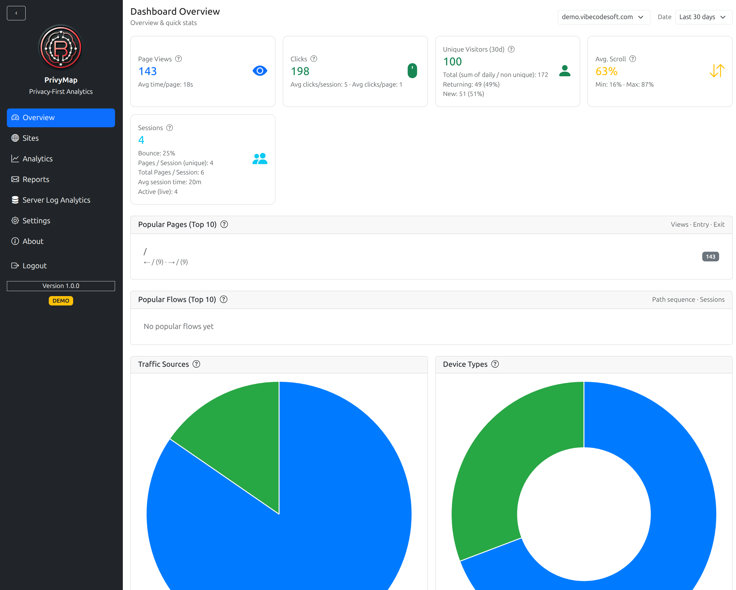 PrivyMap is a lightweight, fully self-hosted web analytics system without cookies and without personal data. Ideal for businesses, developers, and agencies that need precise usage analytics – without tracking bloat and without GDPR risks.