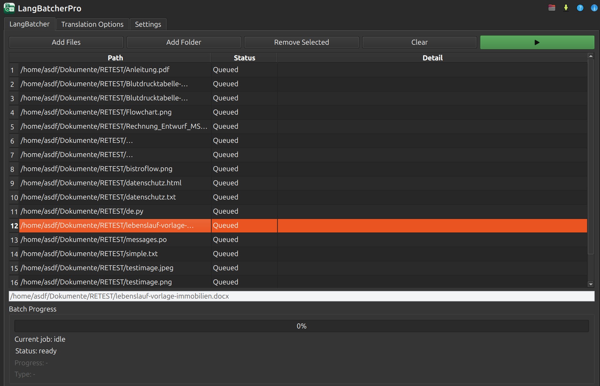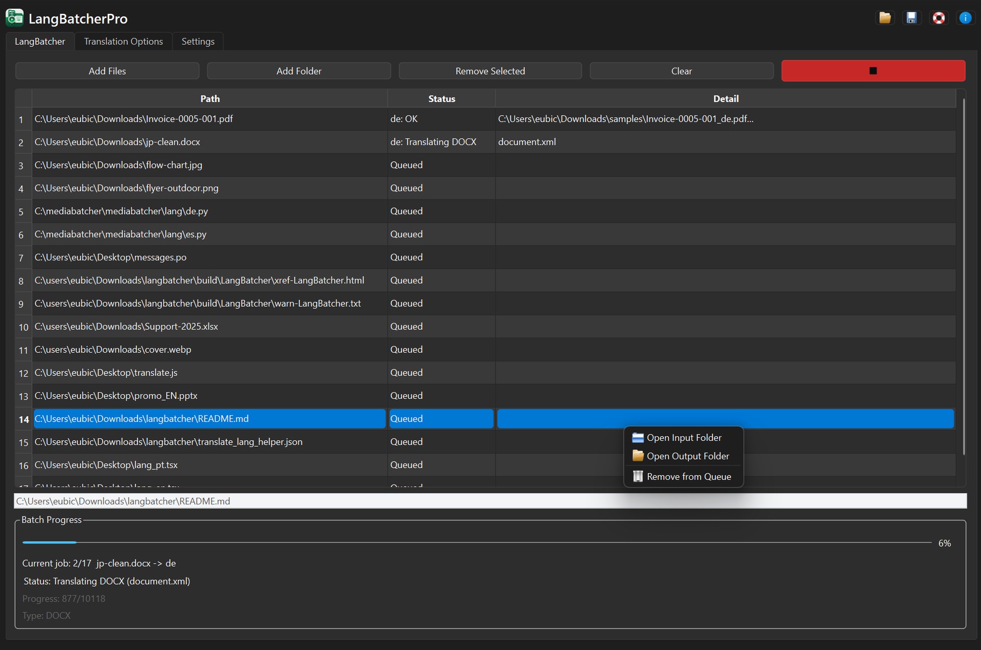 Füge Dateien oder komplette Ordner hinzu – und LangBatcher übernimmt den gesamten Übersetzungsprozess:
